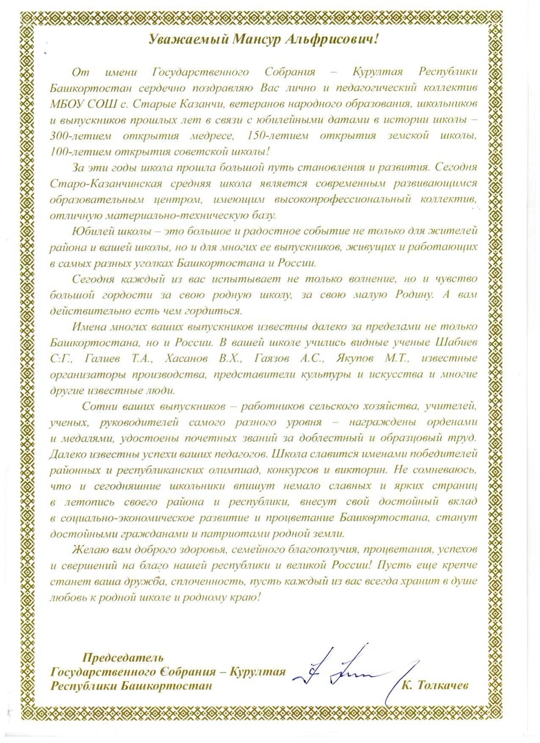 Вот и наступил тот день, которого все ждали-7 июля мы праздновали юбилей школы. В этом году совпали сразу три значимые даты: 100-летие советской школы, 150-летие земской школы и 300 лет первой мечети и медресе. Огромная роль в установлении данных исторических фактов, не говоря уже о всесторонней помощи принадлежит нашему выпускнику Гаязову Альфису Суфияновичу.