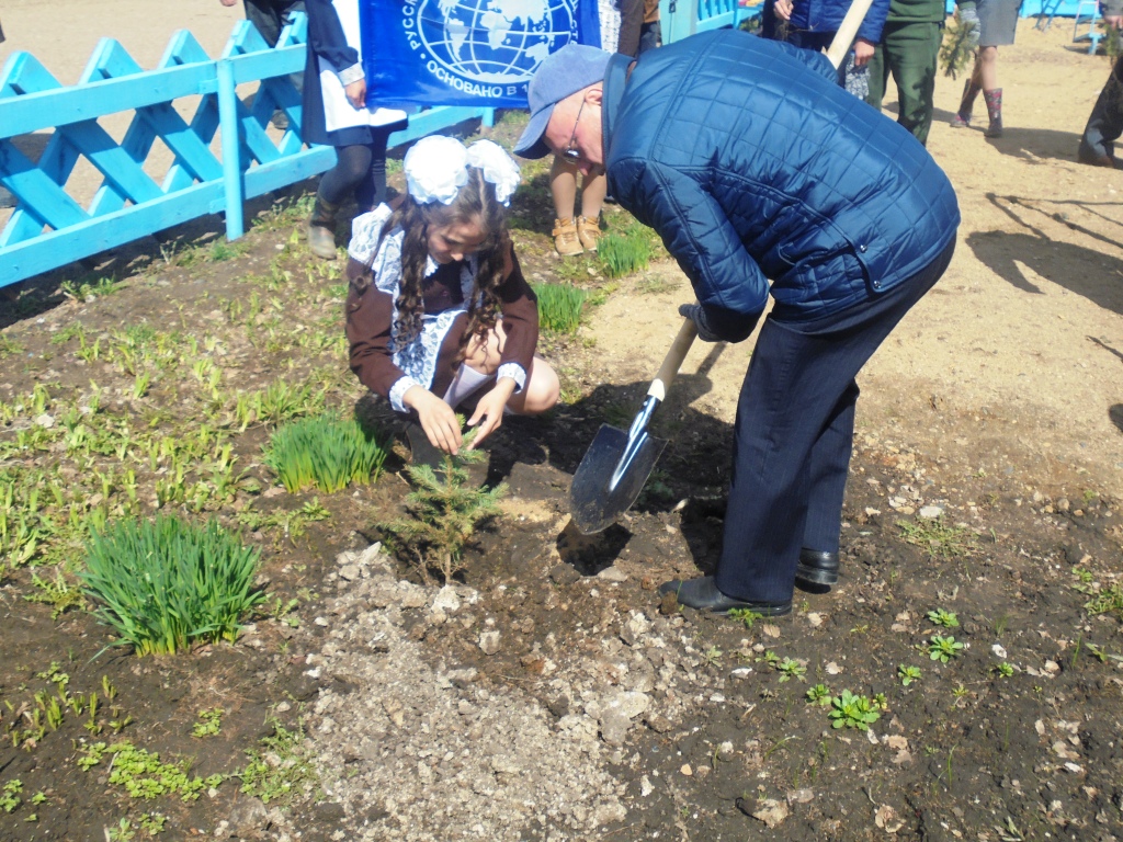 После встречи с учащимися и пед.коллективом школы А.С.Гаязов участвовал в посадке голубых елей на территории своей родной школы.
